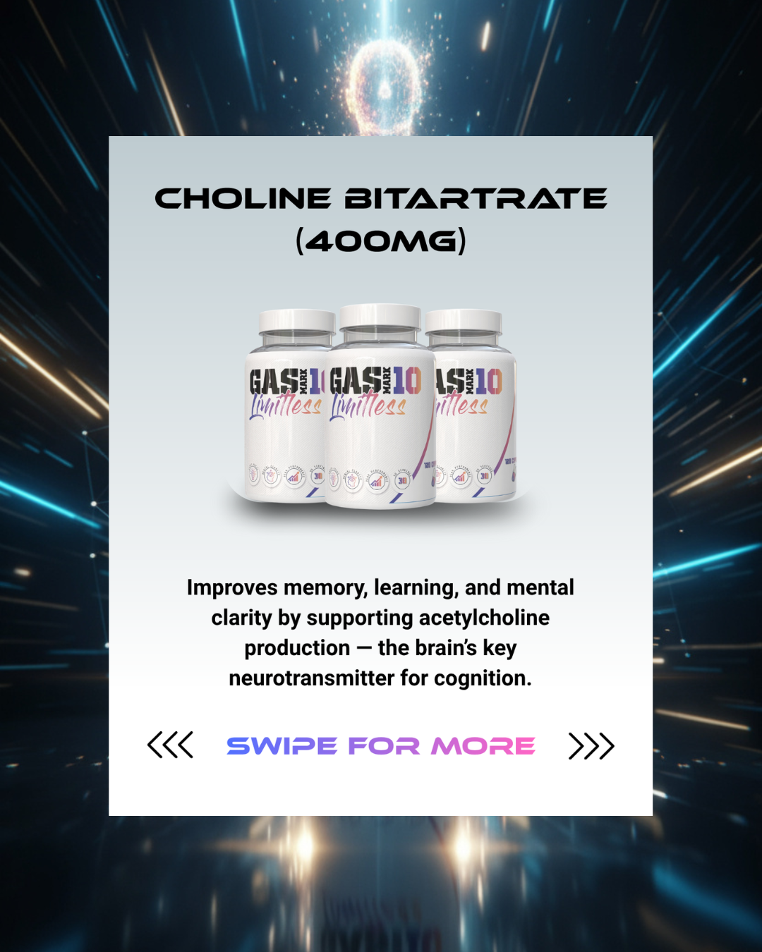 Choline Bitartrate (400mg): Enhances learning, memory, and brain signalling.