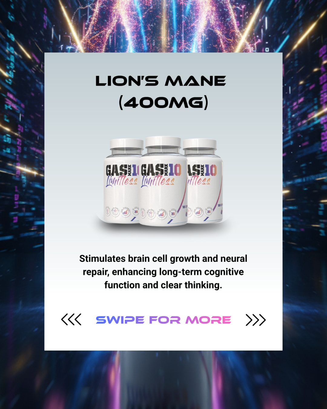 Lion’s Mane (400mg): Promotes neurogenesis and long-term brain health.